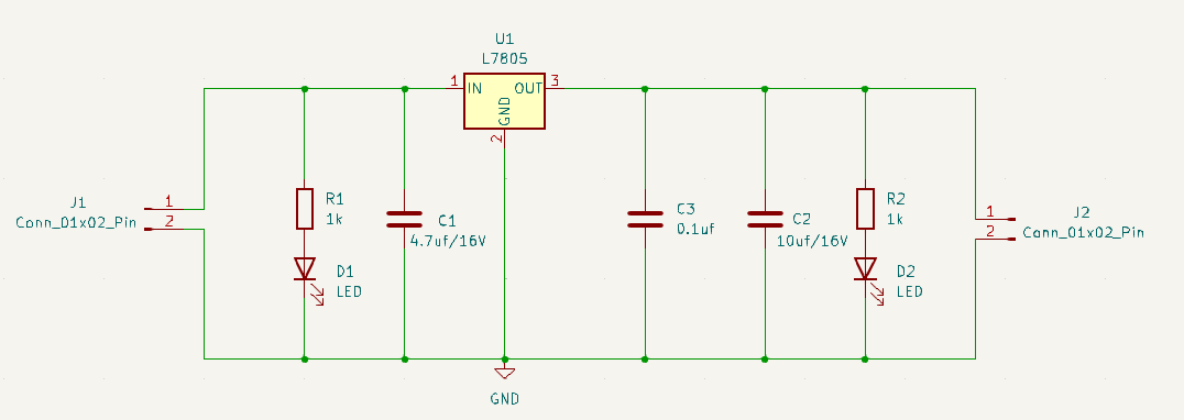 To introduce myself to the KiCAD environment and practice PCB design, I created a simple 5V voltage regulator that uses the L7805 IC based on the schematic to the left. The project files for the PCB are available for download below!